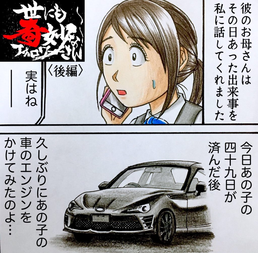 【3話】伝えられなかった返事 2020/01/26 mollyさんからの投稿 職場に現れたツナギ姿の彼・・・。 あれは絶対に見間違いではないと確信したmollyさんは、思い切って彼のお母さんにその事を電話してみました。 すると・・・。 mollyさんからの投稿は以上になります。オススメの感動話はこちら↓天国の親友が守ってくれた話迷子の私を救ってくれたのは… 「伝えられなかった返事」カテゴリの最新記事 タグ :#molly < 前の記事次の記事 > コメント コメント一覧 (32) 1. さんかく 2020/11/12 13:09 とても良いお話に胸が温かくなりました。 0 babareo がしました 7. 2022/07/31 02:03 >>1 最後の携帯のくだりで一気に嘘松臭くなった 0 babareo がしました 15. 名無し 2022/08/09 17:53 >>7 ごめん。自分も7に同意。形見分けとかで携帯もらうなら訳わからんでもいい話しだなで終わったけど、使う人いない携帯充電するか? ツナギ捨てられないからマネキンに着せてたらマネキンの足の裏が泥とかで汚れるようになった。彼はたびたび会いに来てくれてるんだなとかのが、まだ話しにオチある 0 babareo がしました 22. ゆ 2022/08/25 08:41 >>15 私の義母は、亡くなった義父の携帯を解約はしても、充電が無くなる前に充電してましたよ。一年以上はやってたと思います。毎日仏壇に置いてありました。 だから充電してることは不思議に思いませんでした。 0 babareo がしました 23. 2022/08/25 15:51 >>7 お盆はあの世の霊が帰ってくる時期 霊体とは、科学的に言えばプラズマ生命体 プラズマは電磁波だから、携帯電話を作動することが出来る (仮に充電されていなくても、プラズマ自体がエネルギーを 持ってるから動かせる) もし彼の霊、意志がそこにあったのならば こんな具合に、映画ゴーストのようなことが、科学的にも 説明はつく 0 babareo がしました 2. 邦彦 2021/02/03 17:39 もし自分が彼の立場なら、自分を忘れて早く先に進んでほしいかな。 0 babareo がしました 4. あ 2022/05/23 00:50 >>2 それは彼と同じ立場になった時に言って下さい こういうコメントいらんわ 0 babareo がしました 20. 2022/08/23 17:34 >>4 ifの話に何まじになってんの 0 babareo がしました 3. がっちゃん。 2022/02/03 16:55 凄く良いお話… 高校の時受験が理由で別れ、ようやく会えるとなったのに事故で亡くなってしまった彼のことを思い出して涙が出ました。 0 babareo がしました 5. ななし 2022/07/30 13:02 成仏できてなさそうだから除霊した方がいいんじゃね!? 0 babareo がしました 6. 1000 2022/07/30 21:50 時々会いに来てたらダメなんじゃ・・・。 0 babareo がしました 18. 名無し 2022/08/21 14:59 >>6 成仏してないんじゃねw 0 babareo がしました 8. だー 2022/07/31 09:11 彼はきっとこの女性には自分のことより、良い人見つけて幸せになって欲しいと思ってるはず。 みんなが幸せになって欲しい!!! 0 babareo がしました 9. a 2022/08/01 09:21 とてもいい話に腕が暖かくなりました 0 babareo がしました 10. aa 2022/08/02 12:46 きっつ 0 babareo がしました 11. ◇ 2022/08/02 14:55 うぅ~ん、流石に大分端折ってるよね?!! どう考えても、バツイチの男性不振の女性が付き合う前の9個下の口説かれてる男性の親御さんに会う事はないだろ… 0 babareo がしました 12. 光明真言 2022/08/04 17:57 良い話だが自分的には信じはしない 粗探ししてケチつけるほど不粋でもないけど 0 babareo がしました 13. : 2022/08/04 20:33 成仏してくれめんす 0 babareo がしました 14. Cinap@FAkids 2022/08/06 22:44 ツナギをかけることとエンジンがかかることになんの因果関係があるんですか? 流石に妄想w 0 babareo がしました 16. 求む李在明大統領 2022/08/09 18:45 >>14 心温まるオカルト話なのに何を無粋な。 0 babareo がしました 17. 南家免独斎 2022/08/20 14:44 リンク元でタイトルだけ見て、NEETの彼が家に居ついて「帰らぬ人」になったのかと思ったら全然違った。 でも最後は、中らずと雖も遠からずだった。 0 babareo がしました 19. 美雨 2022/08/23 09:59 久しぶりに読み返してまた涙が出そうになりました。 急になくなった人の携帯を解約せずにそのままにしておくのは、亡くなったことを知らずに連絡してくる人の為というのがあります。とても意味があります。地元に帰った大学の友人の携帯に2年ぶりに連絡したら、お兄さんが出て、彼が亡くなったことを知った事がありました。地方でしたが、すぐにお線香をあげにいきました。あの時、お兄さんが出てくれなかったらずっと知らないままだったと思います。 そもそも、このお話の「なるはずのない携帯がなった」というのが、電源が入っていないのに着信したのか、解約してあるのに着信したのか、着信音ではない別の音がなったのかわかりませんが、、、 0 babareo がしました 21. 五月雨と失恋 2022/08/24 03:36 まあいつかは、彼のご両親も来なくてもいいよと言う日が来るんだろうな そうじゃないと前に進めないから 私の身内もそうだったので それをいってから次の墓参りに言ったときに 墓石にイニシャルが掘られててなんか気分悪かった これY君と同じイニシャルだわ…ってすぐに気がついた