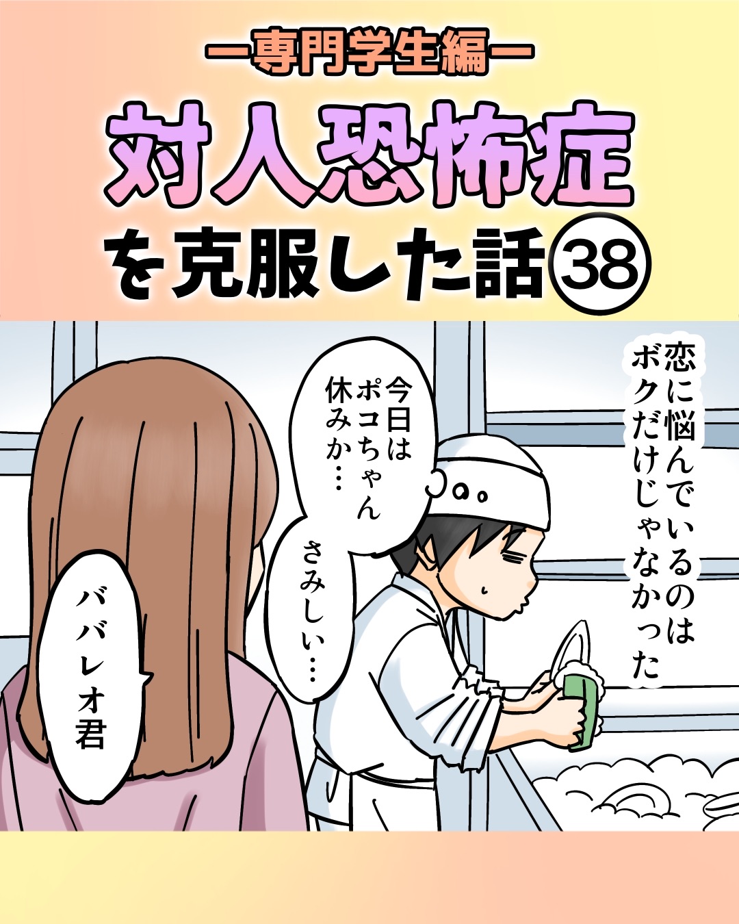 対人恐怖症を克服した話〜専門学生編【38】 2025/03/23 前回のお話↓最初から読む↓まともに恋愛したことない奴が恋愛相談を受けるという生まれて初めての状況。何を言えばいいのかサッパリ分かりませんでしたが、自分なりに精一杯しぼりだして考えました。こういうことも「人と接するとはどういうことか?」という勉強になりましたね。