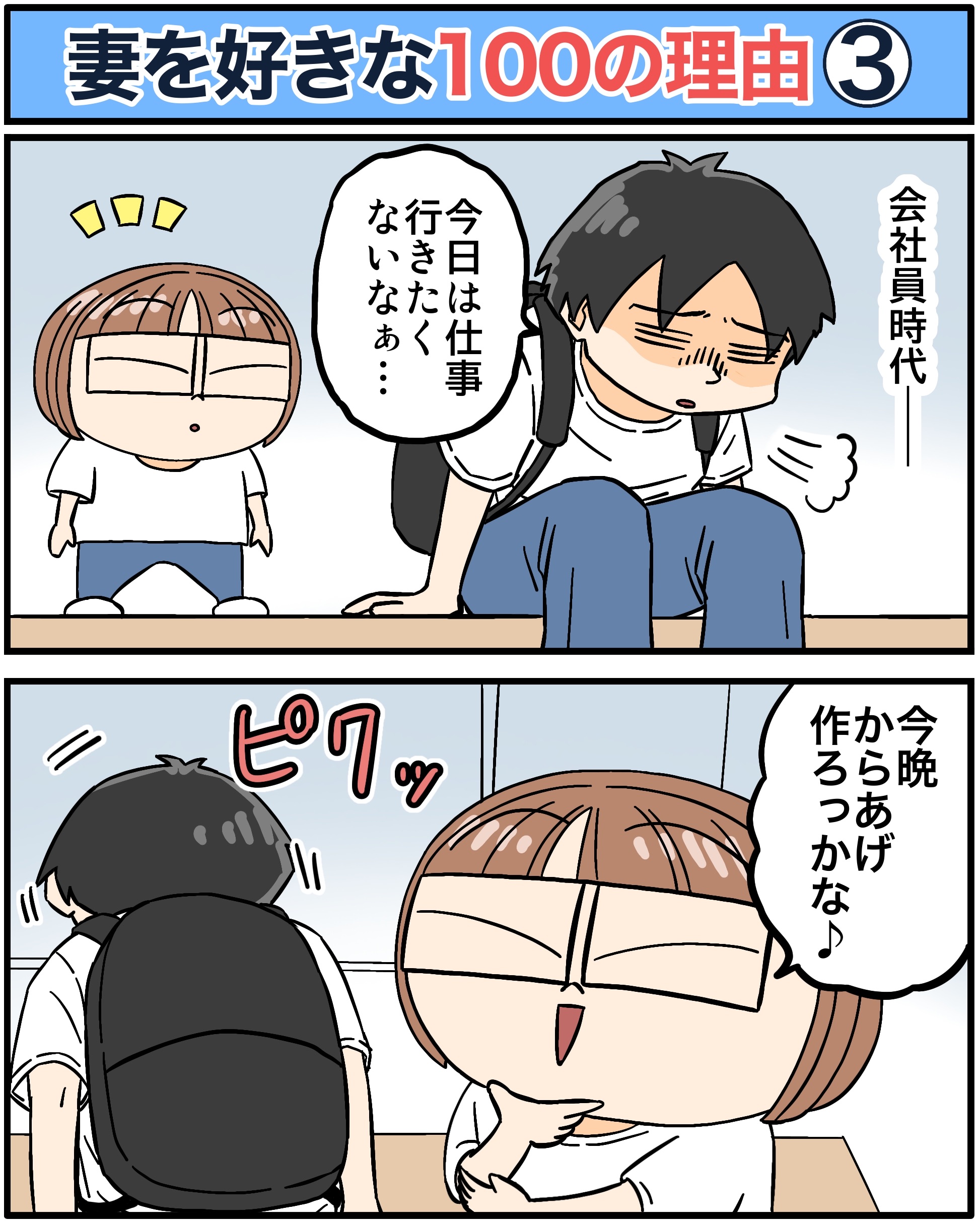 僕が妻を好きな100の理由【3】 2025/11/26 すごくいい子です。すごくいい子。 こちらもオススメ【歯列矯正始めて2年経ったので経過報告】 「僕が妻を好きな100の理由」カテゴリの最新記事 < 前の記事次の記事 > コメント コメント一覧 (13) 1. な 2025/11/26 18:47 素敵すぎる!お二人とも♡ 0 babareo がしました 2. まき 2025/11/26 18:54 羨ましいご夫婦❤︎ 0 babareo がしました 3. はち 2025/11/26 20:01 素敵です! 0 babareo がしました 4. 🍟 2025/11/26 20:04 なんだこのほっこりする漫画は🥹幸せのお裾分けありがとうございます🙏 0 babareo がしました 5. 素敵 2025/11/26 20:29 奥さんの料理を褒めるなんて。 ヨメ子さんも幸せですね。 0 babareo がしました 6. ななしさん 2025/11/26 21:13 これだけを見てもヨメ子さんが最高であることが十分すぎるぐらい伝わってきます( ´∀` ) 0 babareo がしました 7. 名無し 2025/11/26 21:26 旦那さんが「美味しい」って言うんだから、きっと人並み以上に美味しいご飯なんすね。 幸せならokてす。 0 babareo がしました 8. アイシー 2025/11/26 21:43 食べたい😋 0 babareo がしました 12. ババレオ 2025/11/27 12:50 >>8 食べてほしい!でも自信がなくて僕以外の人間に食べさせるのは嫌みたいです笑 0 babareo がしました 9. ひよこ 2025/11/26 23:14 最高です 0 babareo がしました 10. ⠀ ⠀ ⠀ 2025/11/27 07:12 以前に、ババレオさんがマンガ家を目指していた時も、一度諦めた時も、奥様は文句も言わずに受け入れて支えてくださったエピソードがあったと記憶してますが、基本的に奥様は本当に慈悲深い方なんだと今回のお話で改めて思いました。100回記念の時は、ババレオさんと奥様の馴れ初めとプロポーズの話を是非よろしくお願いします。 0 babareo がしました 11. ババレオ 2025/11/27 12:49 >>10 ヨメ子はどんな僕でも受け止めてくれる、本当に慈悲深い人間です。毎日助けられてるなぁと思います 0 babareo がしました 13. s 2025/11/29 17:09 ❤️❤️❤️ 0 babareo がしました コメントフォーム 名前 コメント 記事の評価 リセット リセット 顔 星 情報を記憶 コメントを投稿する