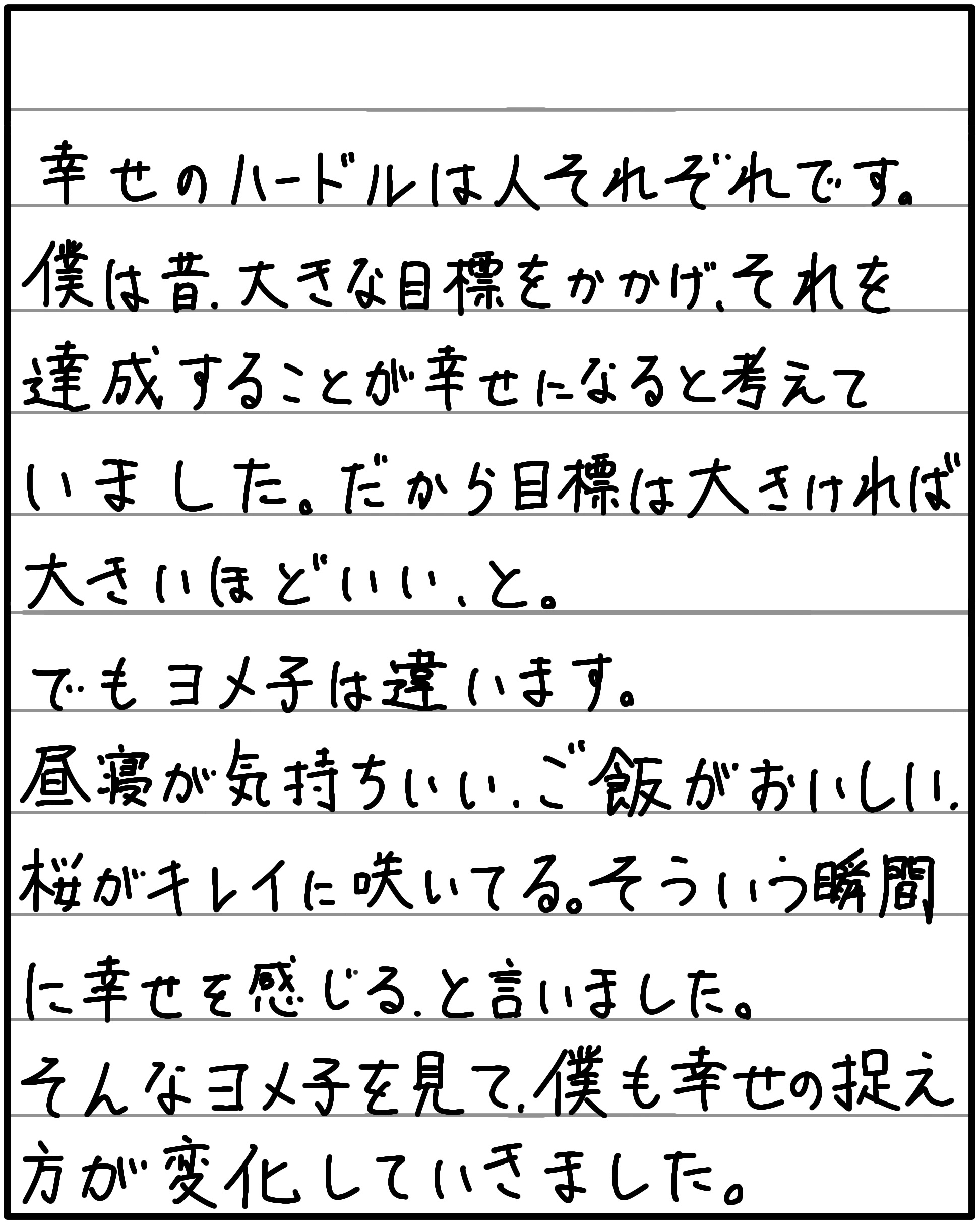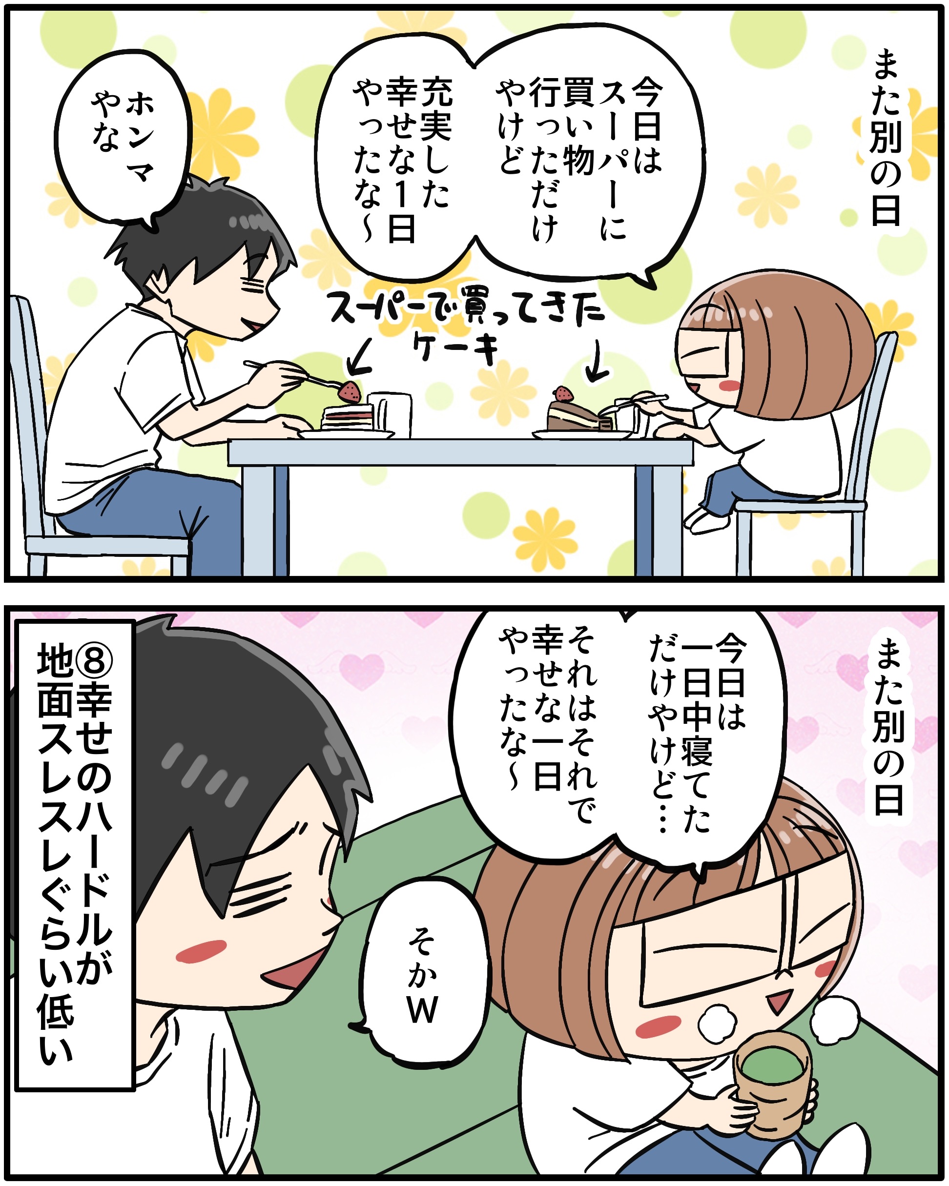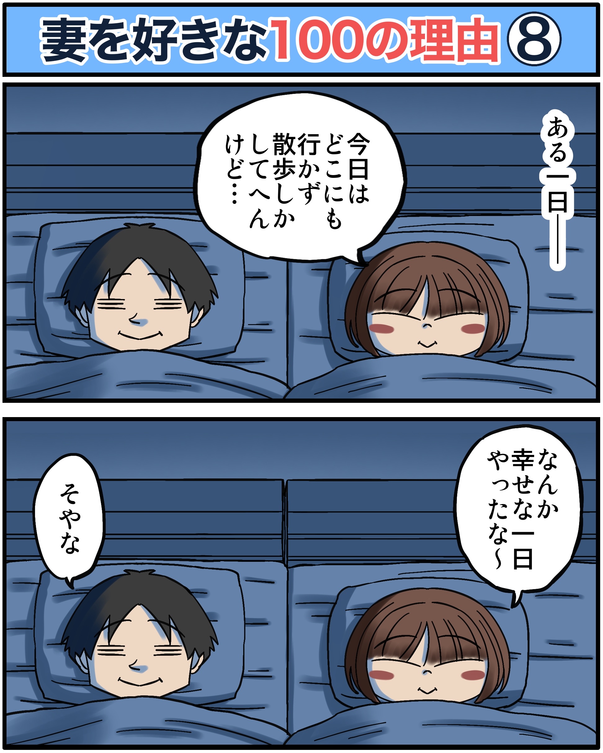僕が妻を好きな100の理由【8】 2025/12/06 幸せとは——。大きな達成が幸せだとすると、人生における幸せはすごく少ない。でもささいなことでも幸せだとすると、人生にはたくさんの幸せがあるということ。どっちの考え方がいいのかと考えた時、ヨメ子の考えは人生を豊かにするよな、と思ったのです。 こちらもオススメ【意味わからん就業規則】 「僕が妻を好きな100の理由」カテゴリの最新記事 < 前の記事次の記事 > コメント コメント一覧 (12) 1. あこ 2025/12/06 18:20 泣ける!ほっこりする😭✨ほんとに嫁子ちゃんステキ😭✨✨それでそう言う話しを教えてくださるババレオさんもステキ😭✨✨2人とも尊い😭🫶🏻✨癒されます😭✨ 良い話し😭😭😭✨ 0 babareo がしました 2. BB 2025/12/06 18:44 旦那様が優しくて、良い人だから幸せなんじゃないかな? 、、、じゃあ、ノロケなんじゃないの〜? 0 babareo がしました 3. おかか 2025/12/06 18:47 嫁子さんステキです。いろいろ見習いたい☺️✨ 0 babareo がしました 4. 多分だけど 2025/12/06 19:32 旦那さんは生まれて結婚するまで、それはそれは沢山、気苦労したんだろう。 だから、嫁コさんみたいな素敵な方に出会えたんだね 良かったですね。 こういう話好きです。 0 babareo がしました 10. ババレオ 2025/12/06 21:09 >>4 それなりに苦労をしたと思ってますが、ヨメ子が支えてくれたおかげで乗り越えられました。 この漫画はその恩返しみたいなものです。 0 babareo がしました 5. 7時 2025/12/06 20:22 ヨメコらぶ🥰 0 babareo がしました 6. ふかふか 2025/12/06 20:25 何気ない一日にも幸せを感じるなんてステキですね❤️ 嫁子さんのような方が側に居ると世界の見え方も良い方に変わりそうです❤️ 0 babareo がしました 7. s 2025/12/06 20:51 ❤️❤️❤️❤️❤️❤️❤️❤️ 0 babareo がしました 8. ありがとう 2025/12/06 20:56 たとえがとてもうまい! 「地面スレスレぐらい低い」って笑える そして笑ったあとちょっと涙が出そうになる ババレオさんはそんなヨメコさんを見ているだけで幸せてすよね 私も毎日幸せを見つけようと思います そう思わせてくれてありがとう あ、今日はこのマンガを読んだことが幸せかも 0 babareo がしました 9. ババレオ 2025/12/06 21:08 >>8 なんて嬉しいコメント これでまた漫画頑張れます 0 babareo がしました 12. てす 2025/12/07 07:14 >>8 じゃなくて「です」でした💦 お返事ありがとうございます 0 babareo がしました 13. 豆腐屋 2025/12/08 15:18 いつも読ませて頂いています 微笑ましいし 羨ましい😄 0 babareo がしました コメントフォーム 名前 コメント 記事の評価 リセット リセット 顔 星 情報を記憶 コメントを投稿する