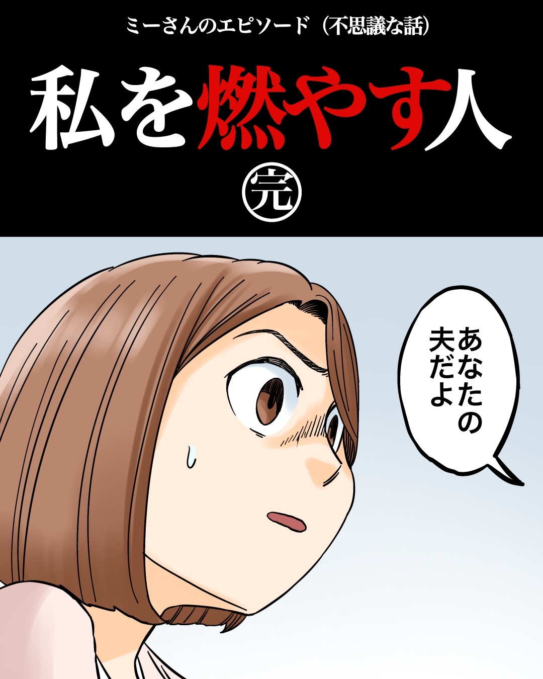 私を燃やす人【完】 2025/12/20 今回はミーさんのエピソードを漫画化させていただきました。今回が最終話です。ミーさんのお話は以上です。 こちらの漫画もオススメ↓【友人の告白…「うちの母さん…本当の母さんじゃない気がするんだ」】続きはこちら↓読者登録はこちら↓ 「私を燃やす人」カテゴリの最新記事 < 前の記事次の記事 >