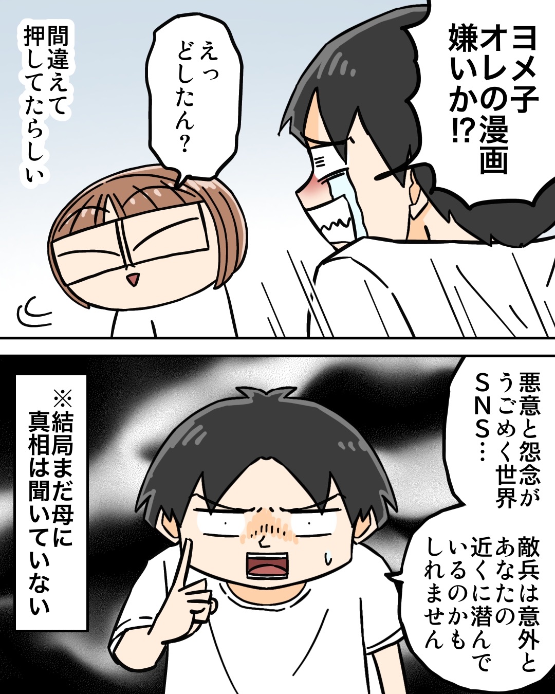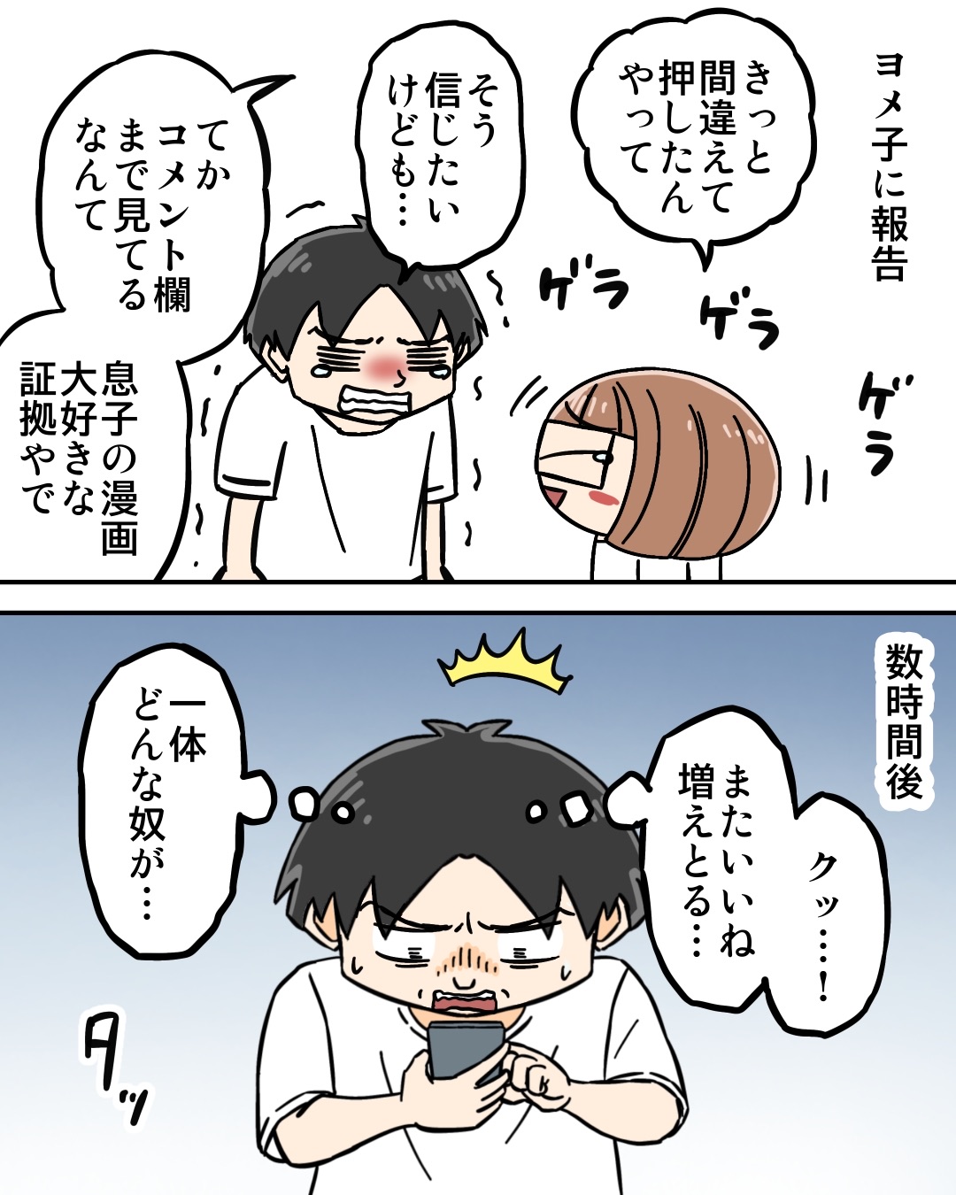 身近に潜むアンチ 2026/02/14 ちょっと驚いたことがありました。ヨメ子と母はグルかもしれない。 「日常ネタ」カテゴリの最新記事 < 前の記事次の記事 > コメント コメント一覧 (41) 1. めぇたん 2026/02/14 18:28 アンチ来ても気にしない方が、一番! 漫画面白くて楽しく読ませてます。 0 babareo がしました 2. ままま 2026/02/14 18:33 すごく面白いですよ! 最近の読者体験を漫画にしたのも面白いけど昔のやつも好き。 たまに思い出して見返したりしてます(^^) 面白いって思ってる人のほうが圧倒的に多いんですよー! 0 babareo がしました 11. ババレオ 2026/02/14 19:46 >>2 うれぴい☺️ 0 babareo がしました 3. ヒデじい 2026/02/14 18:37 お母さん、コメントくれた人にありがとうのつもりで♥いいねしたのでは? 早く確認しましょう 0 babareo がしました 4. 丁度いい機会?だからぶっちゃける 2026/02/14 18:37 敵意とか悪意とか怨念とか抜きにして あんたのエッセイ漫画はつまらん 0 babareo がしました 13. ババレオ 2026/02/14 19:50 >>4 もしかして…お母さん? 0 babareo がしました 5. 骨爺 2026/02/14 18:46 普段、あまりコメント等しませんがババレオさんの漫画好きです。商業誌に載っていたら買うレベルで。絵柄も好きですが、構成も含めて好きです。もちろんこれからも応援する所存です。 0 babareo がしました 12. ババレオ 2026/02/14 19:47 >>5 うれしすぎ! 商業では出てないので、いつか出たらよろしくお願いします😊 0 babareo がしました 6. ななし 2026/02/14 19:02 面白く読ませて頂いています(^^) イラストも綺麗ですし…。 他の方みたいに書籍化にならないかなと思うほどです。(もし書籍あればすみません) 0 babareo がしました 7. うししし 2026/02/14 19:20 漫画は好きです 昔はいいねしかなくて あなたの考えに反対ってできなかった その頃の癖であんまり意見言わないんですけど いまでも反対意見にうっかりいいねを押してしまうことあるみたいです 0 babareo がしました 8. ねむ 2026/02/14 19:23 私は大好きです!!! 0 babareo がしました 10. やまちゃん 2026/02/14 19:46 ババレオさんの絵は、上手いしマンガも面白い! アンチの声に惑わされないでね! 0 babareo がしました 14. フォローしています❣ 2026/02/14 19:58 多分、ババレオさんに嫉妬している誰かの仕業だと思います。そして♥️は賛同ではなくて、チェックしましたよ。という意味ではないでしょうか? ヨメ子さんとお母様がグルではないかという表現もユニークで私は好きです❣ 0 babareo がしました 15. 桜桃 2026/02/14 20:18 私は好きですよ(^-^) いつも楽しく見てます! 0 babareo がしました 16. ババレオさんの 2026/02/14 20:38 更新が来たら楽しみに見ている者です 読んで合わなかったりつまらないと感じたらもう読みに行かない派なのでアンチの心理はわかりませんが無視でいいんじゃないかな 0 babareo がしました 17. BB 2026/02/14 20:51 アンチの人にアンチです。 それと、間違えてイイねしてるにヒトシクン人形(知らんか?) 0 babareo がしました 18. カプ 2026/02/14 20:52 めちゃくちゃ面白いですよ! いつも楽しみにしてます! 0 babareo がしました 19. みいま 2026/02/14 20:55 いつも楽しく拝見しております。 自分も還暦をすぎまして、目も手もおぼつかないのですが、スマホは欠かせないものとなり追いつくのに精一杯です。うっかり押しても気づかないこと本当に多いんですよね。私も気をつけたいです。ババレオさんはこれからも応援してます。 0 babareo がしました 20. カルマ 2026/02/14 21:44 私も皆さんと同じくババレオさんの漫画大好きです。 アンチがいるってそれだけ人気があるってことです。 気になるとは思うけど気にせずこれからもババレオさんの世界に連れてってください!! 応援してます☺️ 0 babareo がしました 22. いぬお 2026/02/14 22:43 他の悪者を懲らしめるだけのスカッと系のマンガと違って、オチがじんわりするのが好き ババレオさんの優しさを感じます 0 babareo がしました 23. ゆず 2026/02/14 23:16 めちゃ面白いですよ! アンチは嫉妬してます うらやましいんです 「愛の反対は無関心」なので 面白くないのならただスルーします 興味ないなら関心持たないんですよ こんなに温かいはげましコメントいっぱいきててすごいです その人たちに面白い作品を届けてね〜 ファイトー😄 0 babareo がしました 24. ドンちゃん 2026/02/15 02:09 心配しないで下さいね☺ あなたの絵は動きがあり 表情もすごく上手だと思います👍 欲を言えばバンバン更新してほしいです☺アハハ 0 babareo がしました 25. わいレオ 2026/02/15 08:51 もしかしてアンチコメに🩷したら人の中にお母さんが居たらオイ❗️と思って和むっていう計算からの母の愛なのかな?笑 お母さんがついてるよって言う感じでね。 0 babareo がしました 26. しげっぴ 2026/02/15 09:16 おもしろいですよ😀 いつも楽しみにしています。 0 babareo がしました 27. 屁ey 2026/02/15 10:22 めっちゃ笑いました!🤣💦 アンチコメントを笑いに変えてしまうババレオさん、援護射撃の達人?のお母さま、ヨメ子さん 面白すぎです アンチアンチも飯のタネ 昨日の