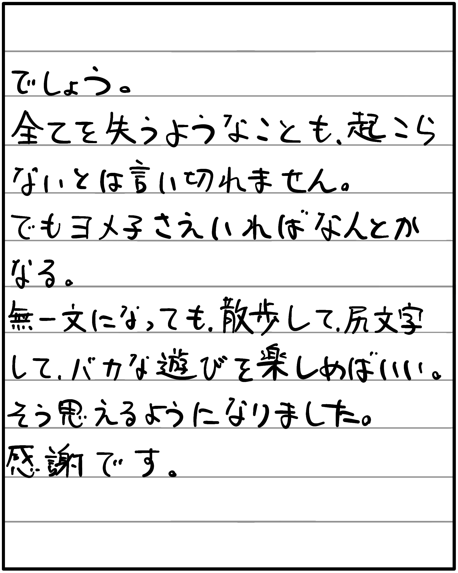 よめこさん、心の土台というか「人生何とかなる!」という感覚が深く染み付いている人なんですね。こんな素敵な人に好かれるババレオさんがどれだけ素敵な人なのか気になります。