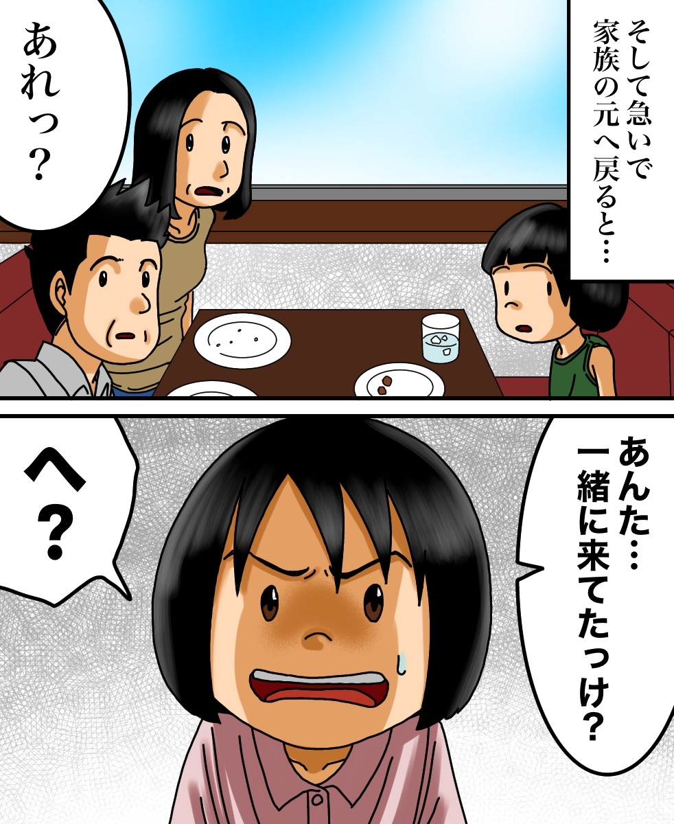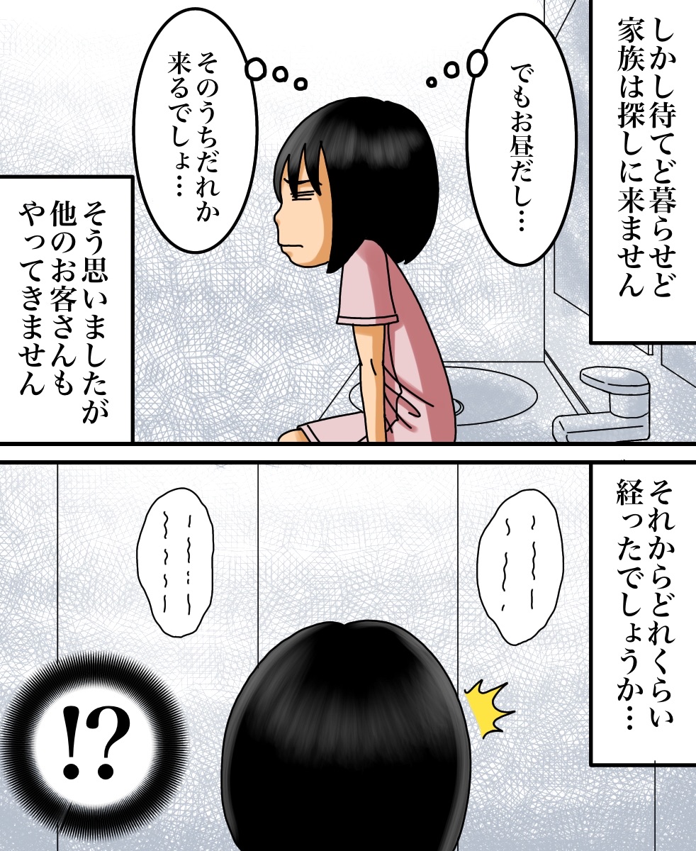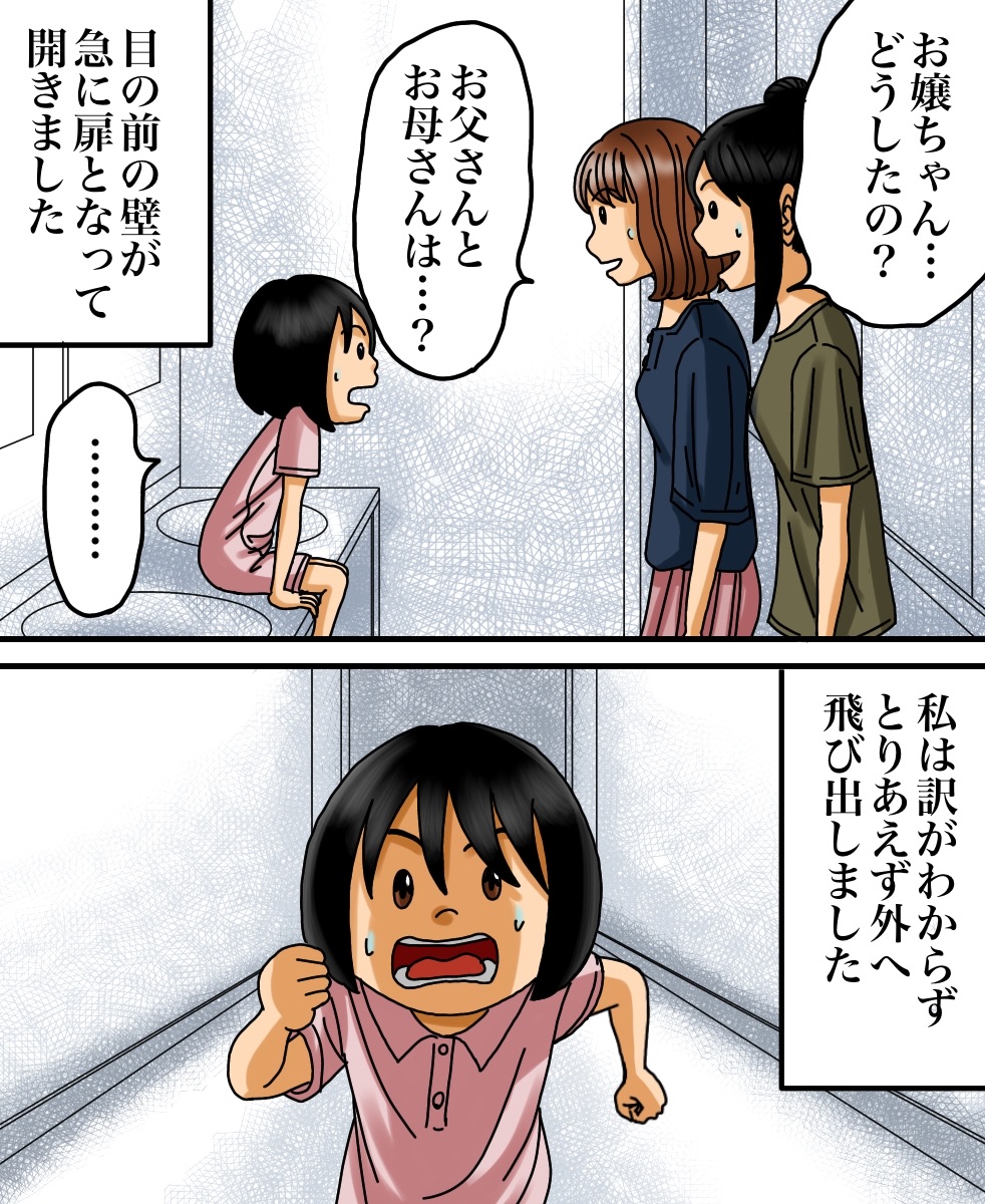 出口のない空間に閉じ込められた話 2021/03/27 今回はヒラサカさんからいただいたお話を漫画化しております。ちなみにこのお店はサイ◯リヤらしいです。みなさま、お手洗いをご利用の際はお気をつけて…。ヒラサカさんからのお話は以上になります。こちらもオススメ↓一人旅に出た先で身の危険を感じたお話 家族で防空壕に行ってから息子に起きた異変 早く先読みしたい!という方は下のおばちゃんの画像をクリックして読者登録お願いします。更新通知を受け取って、いち早く漫画が読めます↓ 「不思議な話」カテゴリの最新記事 < 前の記事次の記事 > コメント コメント一覧 (12) 1. うしろのななし 2021/03/27 09:12 家族はテーブルに残されてた「誰の物か判らない食べかけの料理」に疑問を持たなかったという事になる…。 0 babareo がしました 2. ババレオ 2021/03/27 09:43 >>1 それがこのお話の怖いところ。。。 0 babareo がしました 9. 2021/09/20 12:10 >>1 そこがやたらリアルで怖いー 0 babareo がしました 3. ぴよ 2021/03/27 10:13 海外の料理屋さんでトイレのドアの建て付けなのか鍵なのかが悪くが開かなくなって子供ながら焦ったし困ったのを思い出しました😂 0 babareo がしました 4. うめこ 2021/03/27 10:20 私も異世界のトイレに行った経験者ですが、色々なパターンがあるんですね(笑) 小さい時の30分位って確かに飽きて冷静になるんですよね(笑) 0 babareo がしました 5. かときち 2021/03/27 14:29 めちゃくちゃ怖い😱 私だったら一人で閉じ込められたらパニクる‼︎ 泣くわ〜😭 0 babareo がしました 6. みはこ 2021/03/27 20:18 妹もサイ○リアでバイトしてる時不可解な現象よくあったって言ってたので人が集まるところはやっぱり何かしら何かが起こるんですかね。。。怖いです。。 0 babareo がしました 7. 2021/03/27 20:48 閉じ込めも怖いけど、それより親に忘れられてるところが怖い 0 babareo がしました 8. 私は泣いた!暴れた! 2021/03/30 12:28 スーパーの引き戸を押しても押しても開かなくて・・ 泣いて暴れてたら大人が来て開けてくれました(●゚ν゚)怖い話じゃなく怖がった話でした あれが扉がない状態になったら過呼吸で死んでるかも((´д`)) ブルブル… 0 babareo がしました 10. 2022/01/26 19:55 ん?ちょっとよくわからなかったw 意味がわからないのもこわい 0 babareo がしました 11. 水無月 2022/06/02 17:46 似たような事が昔あった。大学のトイレだったかな 知り合いが用終えるのを手洗い場で待ってるときに、トイレから出てきて出入口の前でUターンしてまたトイレに入ってった。『💩第二波かな 』って思ってのんびり待ってたら何秒か経ってまた出てきたら、トイレの出入口が無かったからめっちゃ焦った。って言ってビビってた。 よくわからないけど、私がこの知り合いがトイレで用を足した。という記憶があったから助かったんだとか言ってた。 0 babareo がしました 12. 水無月 2022/06/02 18:06 >>11 後一旦トイレに戻った理由が、自分が用足した時間分をトイレの中ですごして再度出れば、出入口が現れるんじゃないかと思ってたんだとか。 おまけに私はずっと手洗い場にいたのに居なかったって幽霊扱いになってた 🥹 0 babareo がしました コメントフォーム 名前 コメント 記事の評価 リセット リセット 顔 星 情報を記憶 コメントを投稿する