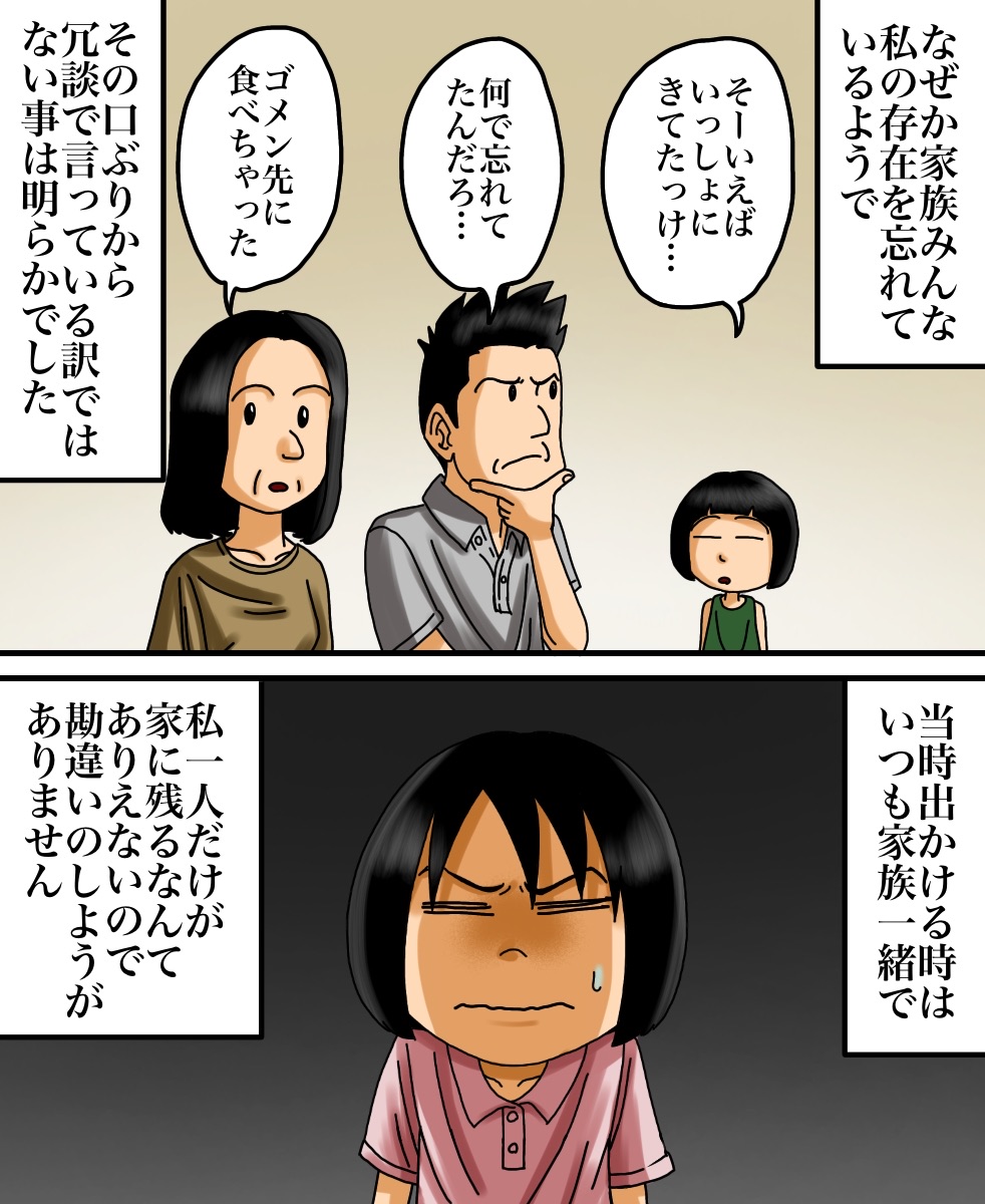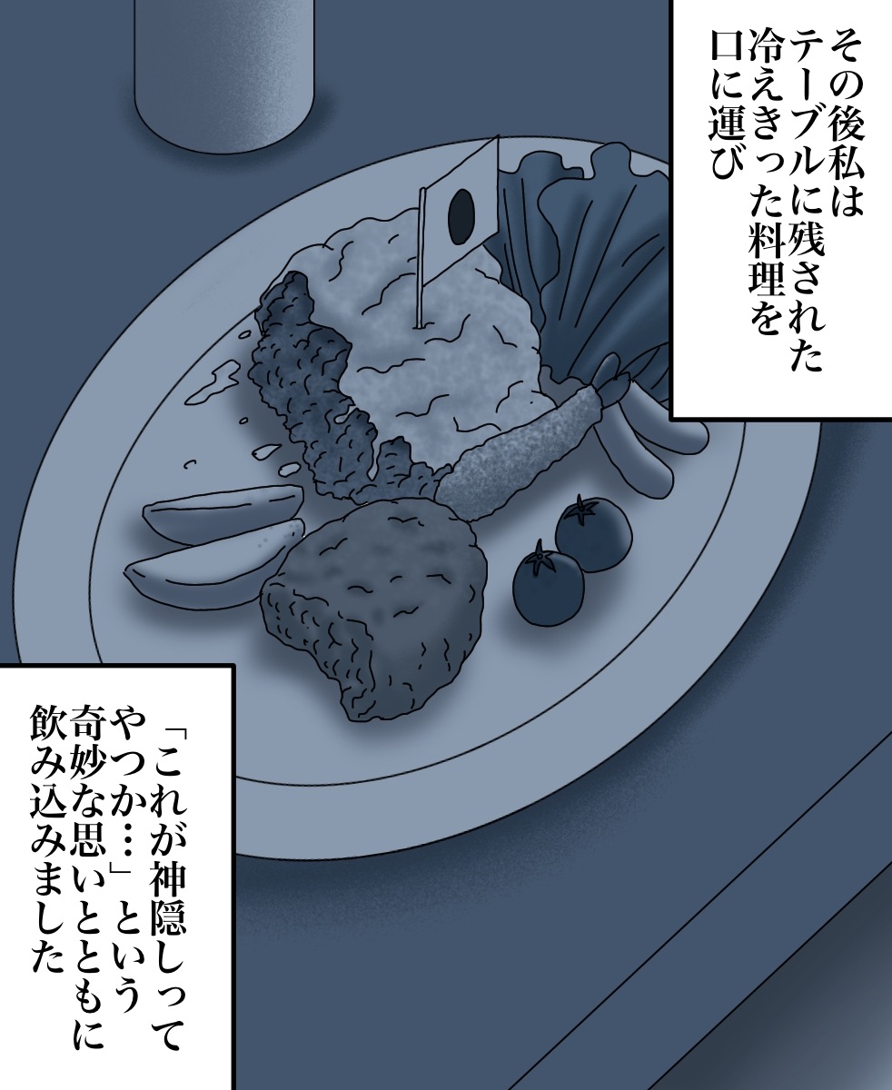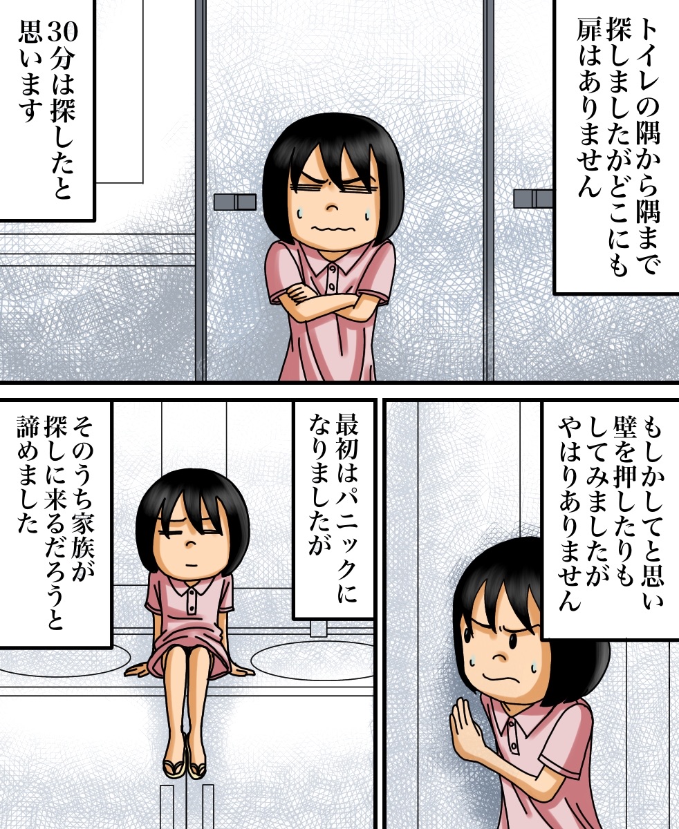 出口のない空間に閉じ込められた話 2021/03/27 今回はヒラサカさんからいただいたお話を漫画化しております。ちなみにこのお店はサイ◯リヤらしいです。みなさま、お手洗いをご利用の際はお気をつけて…。ヒラサカさんからのお話は以上になります。こちらもオススメ↓一人旅に出た先で身の危険を感じたお話 家族で防空壕に行ってから息子に起きた異変 早く先読みしたい!という方は下のおばちゃんの画像をクリックして読者登録お願いします。更新通知を受け取って、いち早く漫画が読めます↓ 「不思議な話」カテゴリの最新記事 < 前の記事次の記事 > コメント コメント一覧 (12) 1. うしろのななし 2021/03/27 09:12 家族はテーブルに残されてた「誰の物か判らない食べかけの料理」に疑問を持たなかったという事になる…。 0 babareo がしました 2. ババレオ 2021/03/27 09:43 >>1 それがこのお話の怖いところ。。。 0 babareo がしました 9. 2021/09/20 12:10 >>1 そこがやたらリアルで怖いー 0 babareo がしました 3. ぴよ 2021/03/27 10:13 海外の料理屋さんでトイレのドアの建て付けなのか鍵なのかが悪くが開かなくなって子供ながら焦ったし困ったのを思い出しました😂 0 babareo がしました 4. うめこ 2021/03/27 10:20 私も異世界のトイレに行った経験者ですが、色々なパターンがあるんですね(笑) 小さい時の30分位って確かに飽きて冷静になるんですよね(笑) 0 babareo がしました 5. かときち 2021/03/27 14:29 めちゃくちゃ怖い😱 私だったら一人で閉じ込められたらパニクる‼︎ 泣くわ〜😭 0 babareo がしました 6. みはこ 2021/03/27 20:18 妹もサイ○リアでバイトしてる時不可解な現象よくあったって言ってたので人が集まるところはやっぱり何かしら何かが起こるんですかね。。。怖いです。。 0 babareo がしました 7. 2021/03/27 20:48 閉じ込めも怖いけど、それより親に忘れられてるところが怖い 0 babareo がしました 8. 私は泣いた!暴れた! 2021/03/30 12:28 スーパーの引き戸を押しても押しても開かなくて・・ 泣いて暴れてたら大人が来て開けてくれました(●゚ν゚)怖い話じゃなく怖がった話でした あれが扉がない状態になったら過呼吸で死んでるかも((´д`)) ブルブル… 0 babareo がしました 10. 2022/01/26 19:55 ん?ちょっとよくわからなかったw 意味がわからないのもこわい 0 babareo がしました 11. 水無月 2022/06/02 17:46 似たような事が昔あった。大学のトイレだったかな 知り合いが用終えるのを手洗い場で待ってるときに、トイレから出てきて出入口の前でUターンしてまたトイレに入ってった。『💩第二波かな 』って思ってのんびり待ってたら何秒か経ってまた出てきたら、トイレの出入口が無かったからめっちゃ焦った。って言ってビビってた。 よくわからないけど、私がこの知り合いがトイレで用を足した。という記憶があったから助かったんだとか言ってた。 0 babareo がしました 12. 水無月 2022/06/02 18:06 >>11 後一旦トイレに戻った理由が、自分が用足した時間分をトイレの中ですごして再度出れば、出入口が現れるんじゃないかと思ってたんだとか。 おまけに私はずっと手洗い場にいたのに居なかったって幽霊扱いになってた 🥹 0 babareo がしました コメントフォーム 名前 コメント 記事の評価 リセット リセット 顔 星 情報を記憶 コメントを投稿する