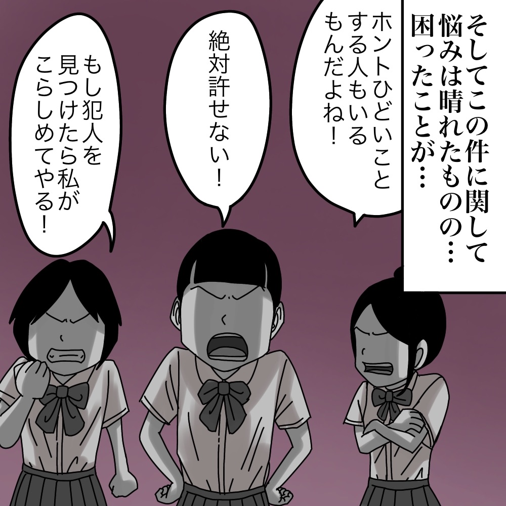 その子から相談されてた友達伝いに知ったことなので直接その子に私じゃないって言ったけど信じてくれたかわからないし、結局犯人が誰なのかもわからないし。