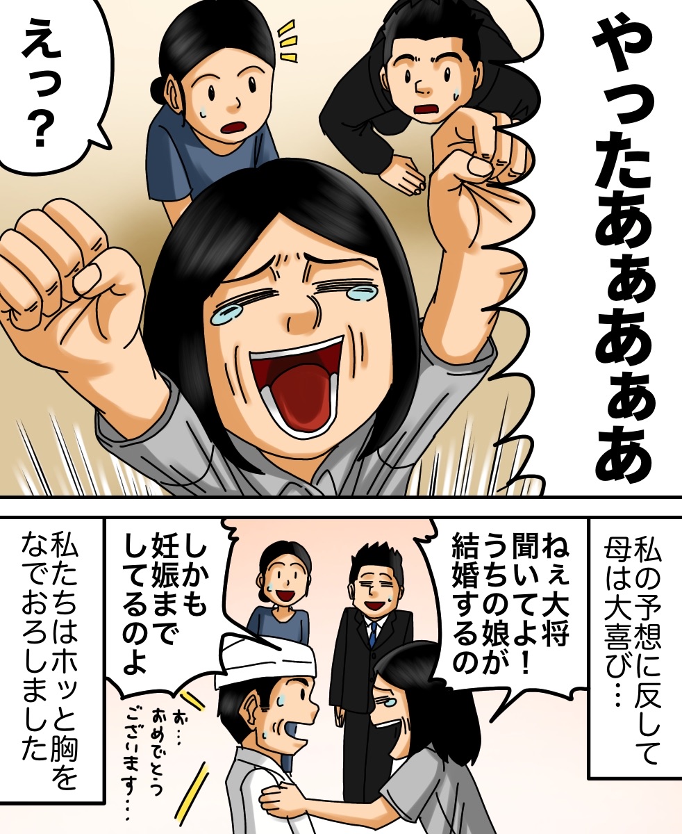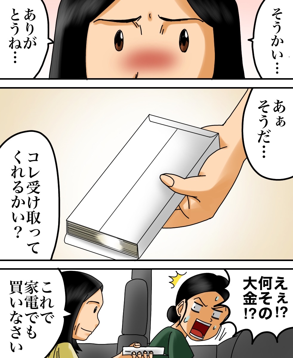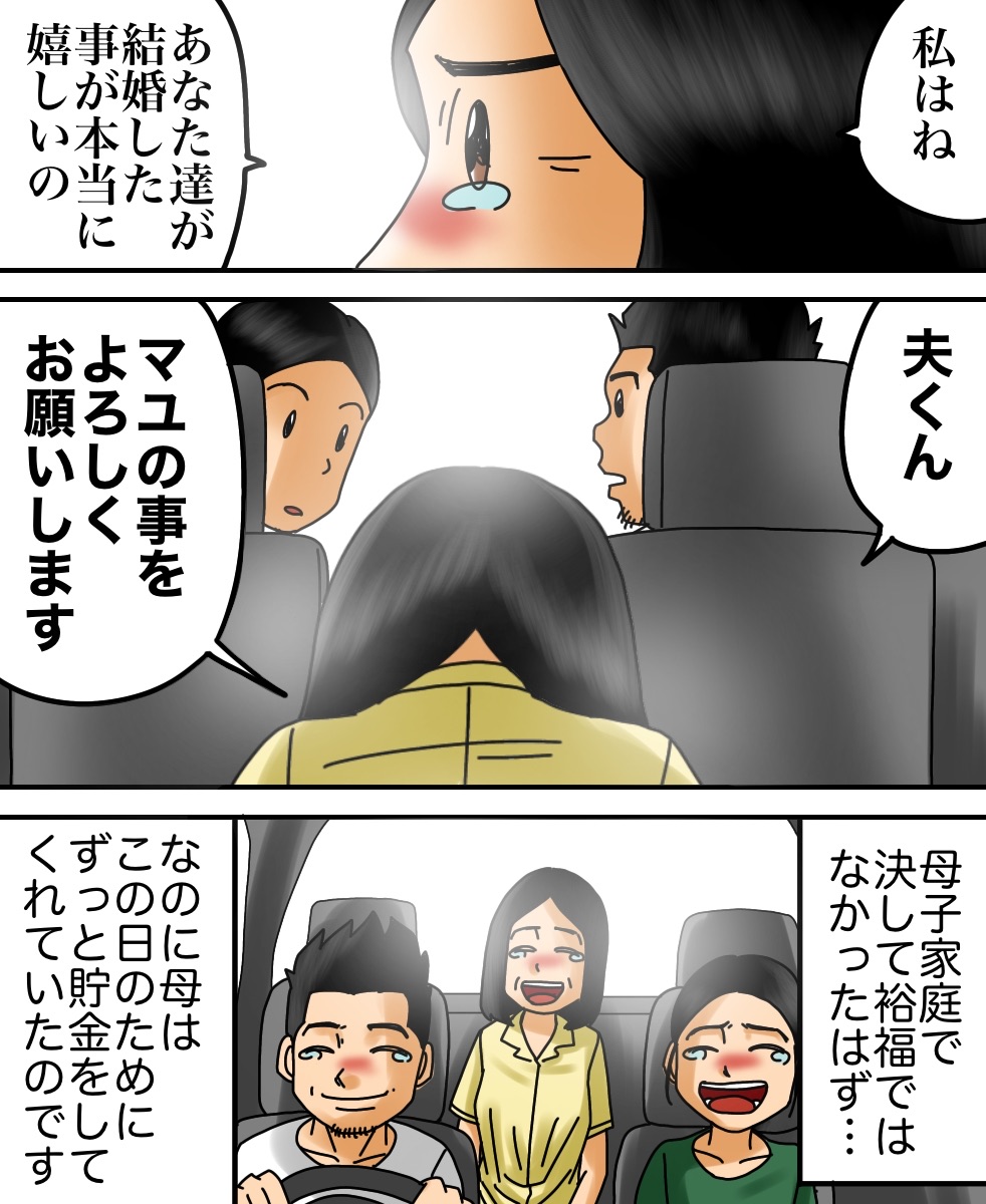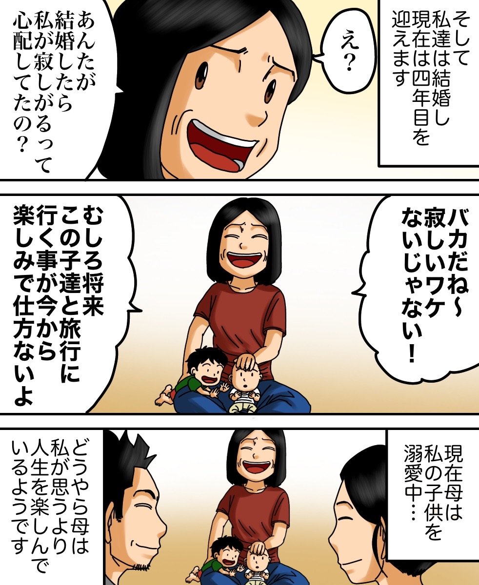 母への心配 2021/05/12 今回はmayuさんからいただいたお話を漫画化しております。mayuさんからのお話は以上になります。こちらもオススメ↓【感動】迷子の私を救ってくれたのは…【感動】喫茶店の常連だった夫婦が来なくなった理由とは… 早く先読みしたい!という方は下のおばちゃんの画像をクリックして読者登録お願いします。更新通知を受け取って、いち早く漫画が読めます↓ 「ちょっと良い話」カテゴリの最新記事 < 前の記事次の記事 > コメント コメント一覧 (16) 1. その 2021/05/12 06:48 子供がかなり小さくてビックリした… 0 babareo がしました 4. とまと 2021/05/12 07:19 >>1 小さいですか? むしろ上手く絵が描けることに私は尊敬しますけどね\(^o^)/ 0 babareo がしました 6. ババレオ 2021/05/12 08:24 >>1 サイズ感間違えたかな 笑 0 babareo がしました 8. よつば 2021/05/12 09:08 >>1 一瞬人形かと思ったよ 笑 でも良いお話でした^ ^ 0 babareo がしました 16. つなまよ 2021/06/17 04:10 >>1 うちの子生後1ヶ月だけどサイズ感ほぼ一緒よ 0 babareo がしました 2. 朝から 2021/05/12 06:50 ホッコリ、素敵な気持ちになりました! 0 babareo がしました 3. ちえみ 2021/05/12 07:18 素敵なお話ですね。 0 babareo がしました 5. jacoleno 2021/05/12 08:11 朝からホッコリしました。亡き母を思い出しちょっと涙……babareoさんありがとうございます。 0 babareo がしました 7. ぽん 2021/05/12 08:59 私も最近子どもを産んだので、自分の母への思いなどと重ねてすごく共感できました!!! 孫はめちゃくちゃ可愛いらしく、嬉しく思わない訳がないんですよね😭✨ 0 babareo がしました 9. 茶色 2021/05/12 11:54 母が生き霊化するのかとドキドキしながら読んだらホッコリするお話しだったので、安心してもう一回読見ました。 0 babareo がしました 10. さこ 2021/05/12 12:32 お母さん、本当は少なからず寂しさもありますよね😭 でも娘さんのことを思って寂しくないふりしたんでしょうね😭 って考えたら、なんて素敵な強いお母さん👏💕 0 babareo がしました 11. きーまん 2021/05/12 17:40 すっごくかっこいいお母さんですね!!寂しくないはずないですよね(T_T) 私もこんなお母ちゃんになりたい!! 0 babareo がしました 12. あ 2021/05/12 20:39 予想に反して大喜び… 0 babareo がしました 13. 名無しさん 2021/05/13 17:00 お母さんの愛情が沁みる(´;ω;`) 0 babareo がしました 14. かあちゃん 2021/05/16 10:49 子どものサイズの話しじゃないでしょ笑 感動させてもらいました。 0 babareo がしました 15. むぎ 2021/05/17 17:23 優しさとか、愛情とかしかない話❤️ 0 babareo がしました コメントフォーム 名前 コメント 記事の評価 リセット リセット 顔 星 情報を記憶 コメントを投稿する