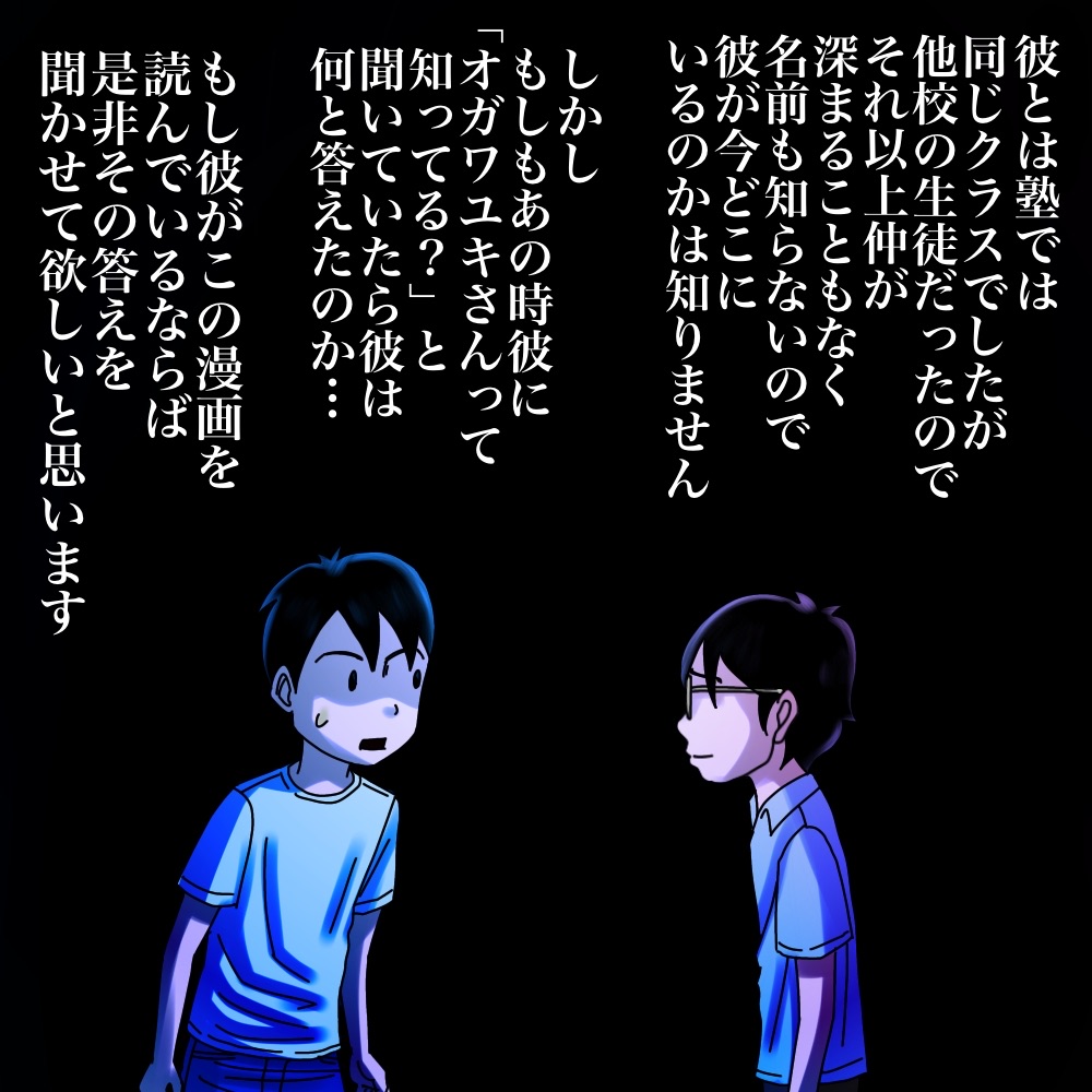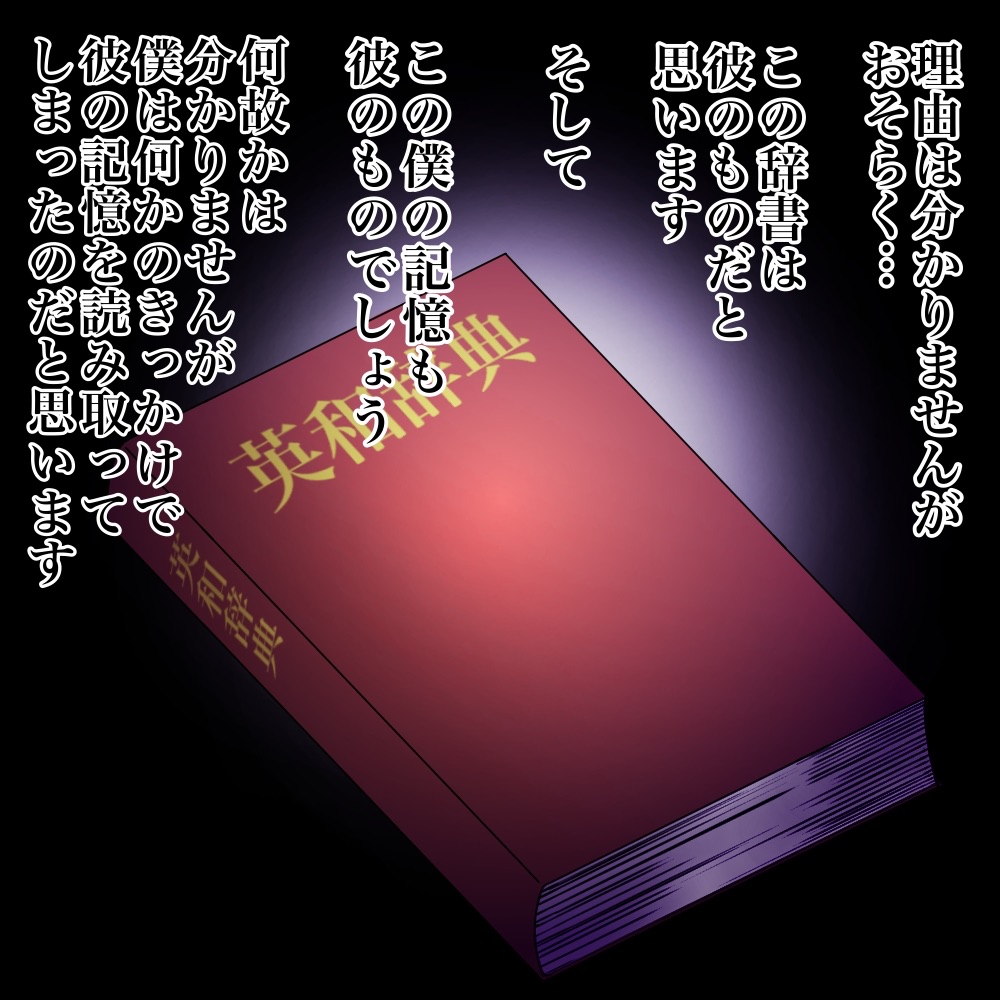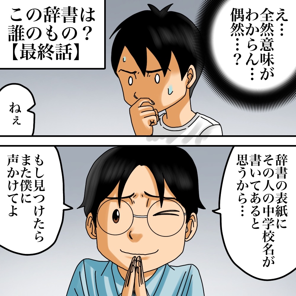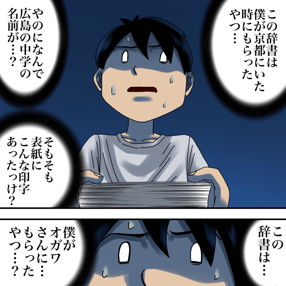 その辞書は誰のもの?【最終話】 2021/05/30 今回はきょうやさんからいただいたお話を漫画化しております。このお話はラジオ番組【伊集院光 深夜の馬鹿力】でも採用されたことがあるという不思議なお話です(きょうやさんご本人です)。前回のお話↓ 最初から読む↓ きょうやさんからのお話は以上です。こちらもオススメ↓恐怖…私は誰かに狙われていた…上司の勇気ある行動に感銘を受けた話早く先読みしたい!という方は下のおばちゃんの画像をクリックして読者登録お願いします。更新通知を受け取って、いち早く漫画が読めます↓ 「その辞書は誰のもの?」カテゴリの最新記事 < 前の記事次の記事 > コメント コメント一覧 (25) 1. Nyaaaaagon 2021/05/30 07:57 えぇぇ∑( °口° )!? そんなことあるんですね… 0 babareo がしました 2. な 2021/05/30 09:12 違法にあげられてるYouTubeをリンクするのはいかがかと… TBSラジオがあげてるものではないですし。 0 babareo がしました 3. ババレオ 2021/05/30 09:46 >>2 すみません。特に何も考えずにリンク貼ってしまいました。 削除いたします。 0 babareo がしました 4. 異邦人 2021/05/30 09:54 >>2 違法かどうかは裁判所が決めることです 殺人や窃盗など明らかに違法な案件を除き、 せめて弁護士などの法律専門家が判断すべきことです 0 babareo がしました 9. 同感 2021/05/30 17:54 >>4 素人の密告社会おかしいね。 0 babareo がしました 20. 2022/05/24 06:49 >>4 明らかな場合を除き って公式以外のアップロードは明らかに違法だろうに 仮に特別にチャンネルが許可を得ているとしても、そういった経緯を確認せずリンクを貼ってしまっているのは管理人さんの不手際だし、諸々認めて即刻削除することは素晴らしい判断だよ 0 babareo がしました 5. きなこ 2021/05/30 10:07 まさかの展開すぎて…!! そんな事ってあるんですね、 すごく面白かったです😲😲 0 babareo がしました 6. キュウコン 2021/05/30 10:34 結局、きょうやさんはその辞書は彼に返したのでしょうか? 私なら、返す時に「オガワユキさんって知ってる?」って聞くと思います… きっと一連の出来事を話して信じてくれなかったとしても、その一言で信じてくれるのではないでしょうかね。 もしかしたら返すことすらしなかったのかもですが( °∀°;) 0 babareo がしました 7. りり 2021/05/30 10:41 どの時点から?と訳が分からなくなったのですが、塾で寝てしまった後からが現実のお話で、学校で辞書を使っていたなどのところは、辞書を落とした彼の記憶ってことですよね、、? 不気味ですが、真相を確かめる意味も込めて、あったよーって返したいところでしたよね😅 0 babareo がしました 8. kekoko 2021/05/30 16:02 えっえっ👀⁉️って感じです!続きが楽しみにしていただけビックリしてしまいました。こんな事ってあるのですね 唯々びっくりです 0 babareo がしました 10. 通りすがり 2021/05/31 00:30 寝ぼけてたのかな? どこかで聞いた話を自分のことだとおもいこんだのかな? ディカプリオの映画であったねそういうの 一人称視点だと不思議な感じ 0 babareo がしました 11. えっ? 2021/05/31 08:24 返したの?返さなかったの?そこも肝心なのにぃー!報告ない時点でモヤモヤしてしまいます… 0 babareo がしました 12. 通りすがり 2021/06/01 14:46 とりあえず辞書を返したのかどうか知りたい 0 babareo がしました 13. 奈名士 2021/06/27 20:15 クリプトムネジアじゃないのかな 0 babareo がしました 14. 「まさゑのバウケン」創始者 2021/07/14 00:27 塾で辞書を触った時、過去の記憶が過去に遡及して作られたんです。 辞書の元の持ち主もきっと、辞書は昨日今日に学校や塾で拾ったんでしょう。 この辞書が今はどこを流通してるのかは、神のみぞ知るところ。 広島県外に出てる可能性も充分あります。 中学生は転校をする生き物のようですので。 オガワユキの記憶。 この話が氷山の一角に過ぎない事は確かです。 0 babareo がしました 15. 死 2021/08/02 07:15 どういう事ダッテバヨ 0 babareo がしました 16. z 2022/02/20 17:18 この脈絡なら返さずにパクったに決まってるよな。 違う学校でも同じ塾で辞書の由来まで聞き取っておいて接点が無かったもない。 人の辞書、人の記憶という事まで理解しておきながらシレッと横領するものだろうか。 返したら真相を聞くことになり、聞いたらネタバレになって謎の霧がかかった読後感を与えられなくなるので、原作者のきょうや氏が手抜きしたな。 0 babareo がしました 17. 愛読者 2022/05/22 08:39 京都と広島の中学校で、同じ辞書がそれぞれ校名をいれて配布されることはあり得ると思います。 きょうやさんが机を間違えて、広島の辞書を取っていってしまったのでは? 京都の辞書は第三者に持ち去られたか、塾の事務局に届けられたかわかりませんが。。 0 babareo がしました 18. 愛読者 2022/05/22 08:41 京都と広島の中学校で、同じ辞書がそれぞれ校名をいれて配布されることはあり得ると思います。 きょうやさんが机を間違えて、広島の辞書を取っていってしまったのでは? 京都の辞書は第三者に持ち去られたか、塾